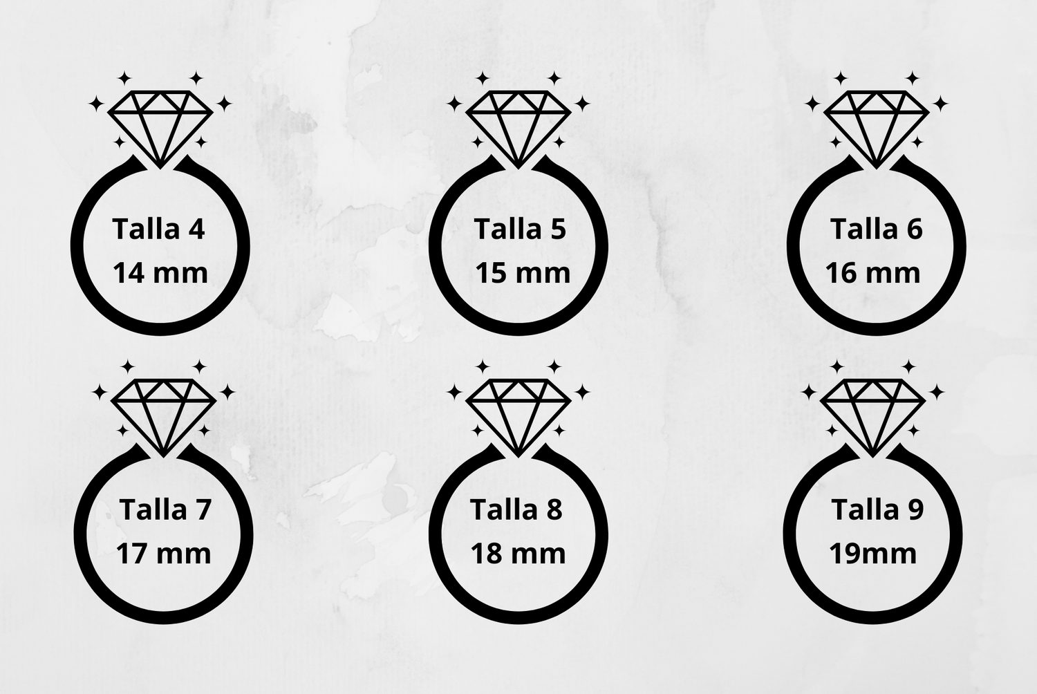 Si no conoces tu talla , no te preocupes, solo tienes que medir el diámetro de un anillo que tengas y comparar las medidas con la tabla que te muestro aquí.
